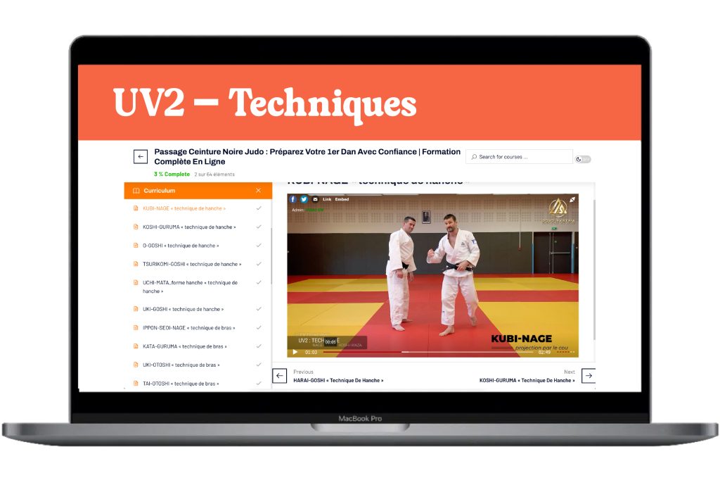 ✅ Les 36 techniques à maîtriser, décomposées et expliquées (Projection, Immobilisation, Clé de bras & Etranglements) + mes conseils de prestation pour le Jour J.